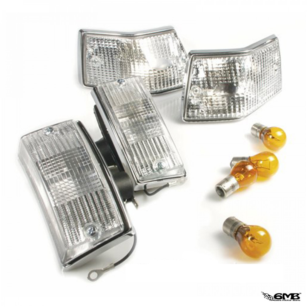 Indicator Kit PIAGGIO front & rear, for Vespa PX80-200/PE/Lusso/T5 Classic, white, chrome casing, incl. bulbs, indicator socket: Bau15s, with e-mark, contacts "7 o'clock" Grade A - for a true to original repair
